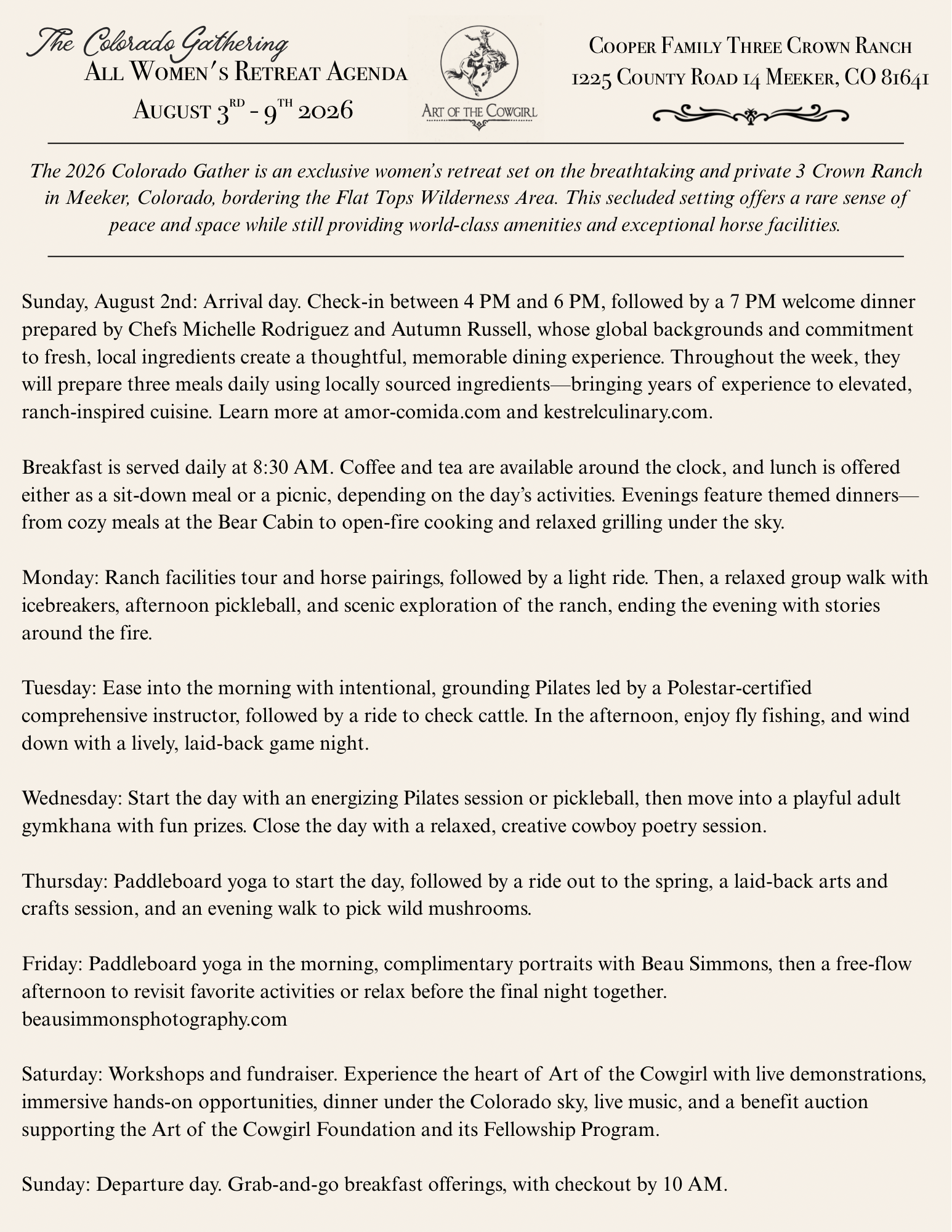 Special experiences throughout the week add to the magic of the retreat, including complimentary portraits with Beau Simmons and a final weekend celebration that showcases the heart of Art of the Cowgirl Foundation. The retreat concludes with a Saturday “High Country Ranch Day” featuring live demonstrations, hands-on workshops, dinner under the Colorado sky, live music, and a benefit auction supporting the Art of the Cowgirl Foundation and its Fellowship Program.