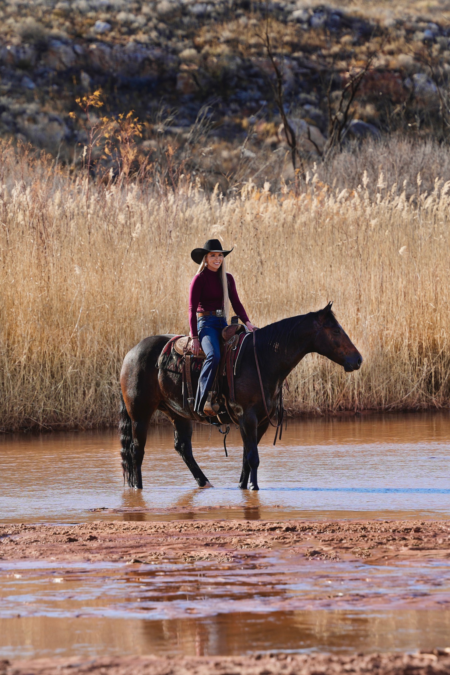 Her long-term goal is to train good horses, contribute to the western community, and never stop learning. She wants to develop strong fundamentals, refine her timing and feel, and eventually help others along their own path with horses.
