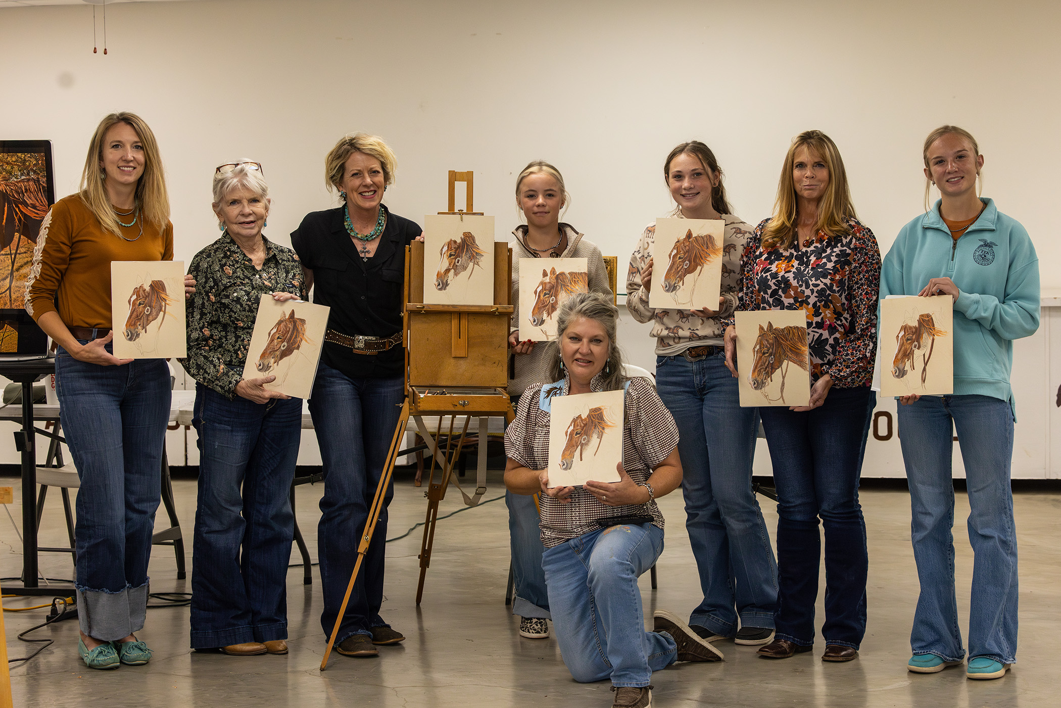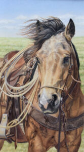Art held another piece of her heart, and she dreamed of a professional art career. Encouraged by teachers and mentors, along with a supportive family, she excelled in art classes throughout school and continued developing her skills in her late 20s through workshops, local classes, and years of practice. Over time, she gravitated toward colored pencil as her primary medium, drawn to its precision, depth and vibrancy, but she also works in oils and pastel. Her paintings portray honest depictions of everyday slices of ranch life and portraits of working ranch horses.