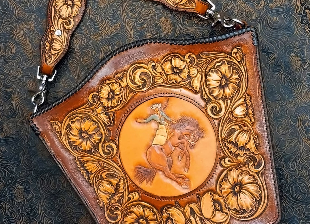 Since 2018, Nancy has been a Master Artist four times, guiding her fellowship recipients in the art of her trade with sound advice and technical skills. Nancy also sits on the Art of the Cowgirl Foundation Board, where she is able to help keep Tammy’s vision and mission alive and well. This year, amidst running her leather shop (there is a six year waiting list for a genuine Martiny saddle), working her ranch, and being inducted into the National Cowgirl Hall of Fame, Nancy found the time to create a beautiful leather purse to submit to our fourth annual Cowgirl Art Contest, and won.